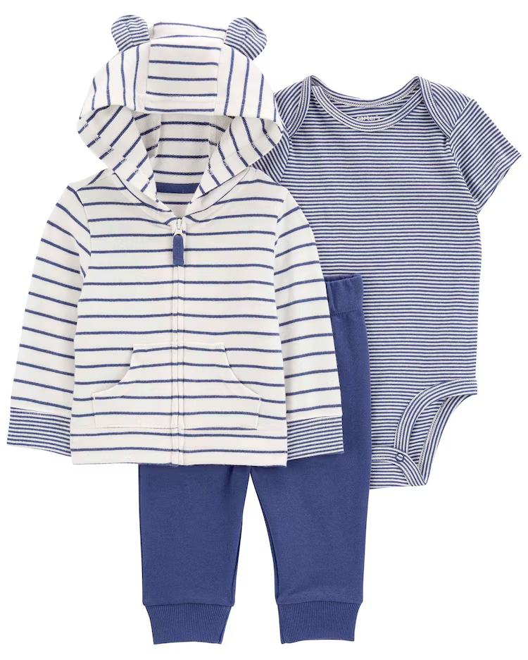 Pensado especialmente para dias mais gelados, o Conjunto longo bebê 3 peças listrado com capuz multicor | Carter's é a pedida ideal para deixar seu bebê bem aquecido. O conjunto conta com 1 body com estampa listrada, 1 calça com cós elástico e uma uma blusa com mangas longas, abertura frontal por zíper e capuz com orelhinhas. Super aconchegante e quentinho, o conjunto vai proteger o seu bebê e ele ainda vai ficar uma gracinha!